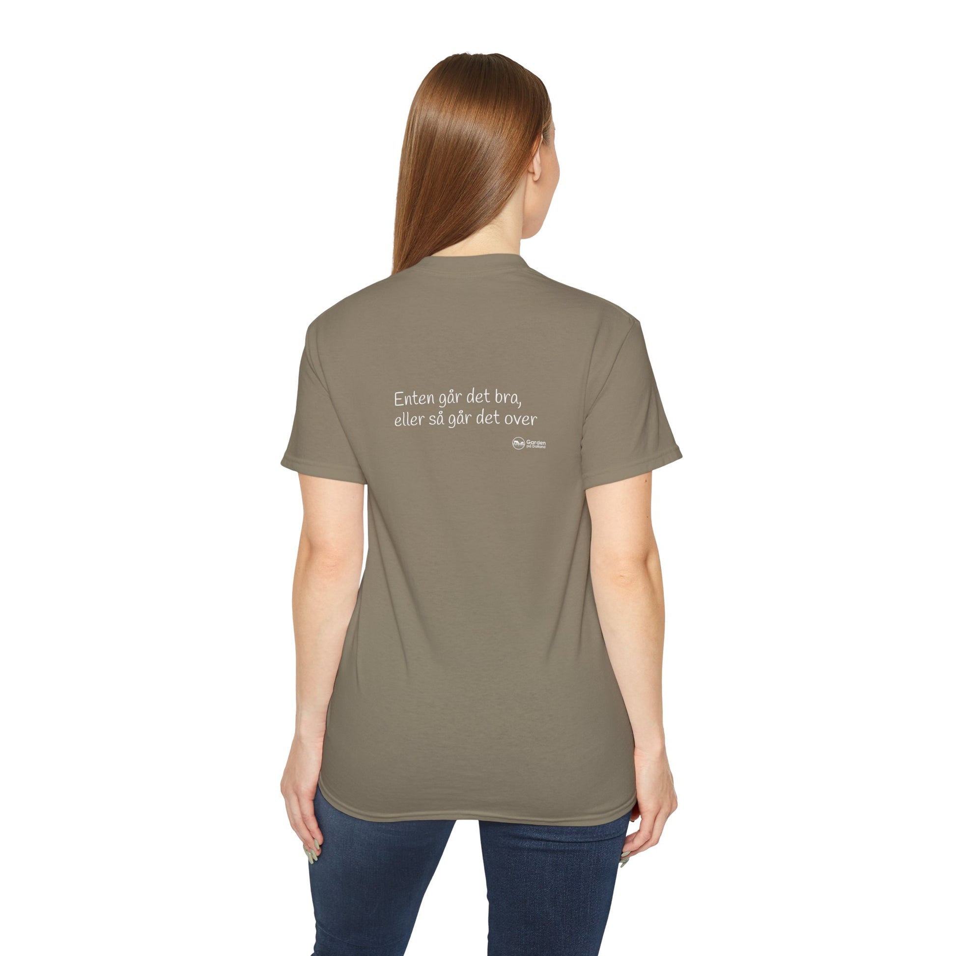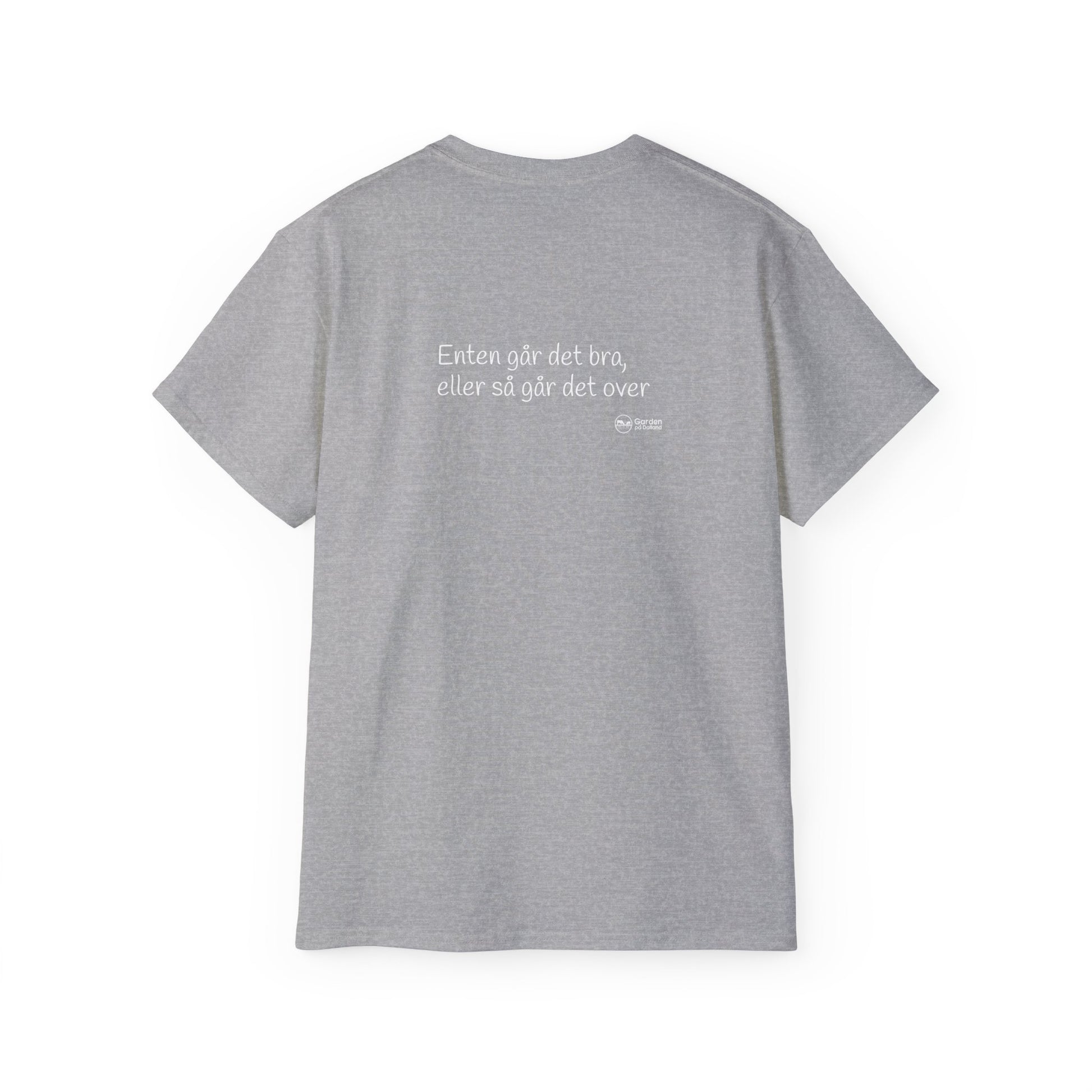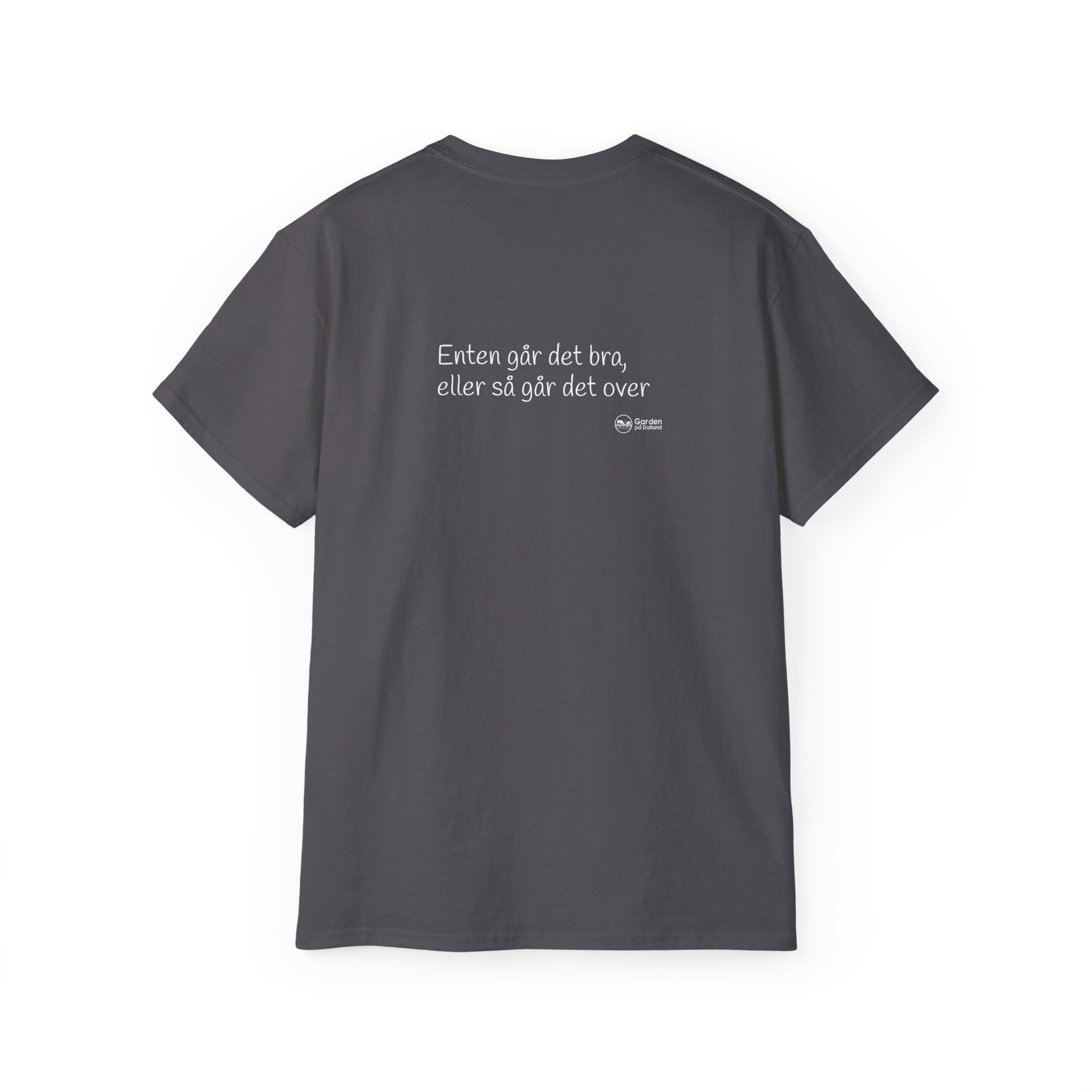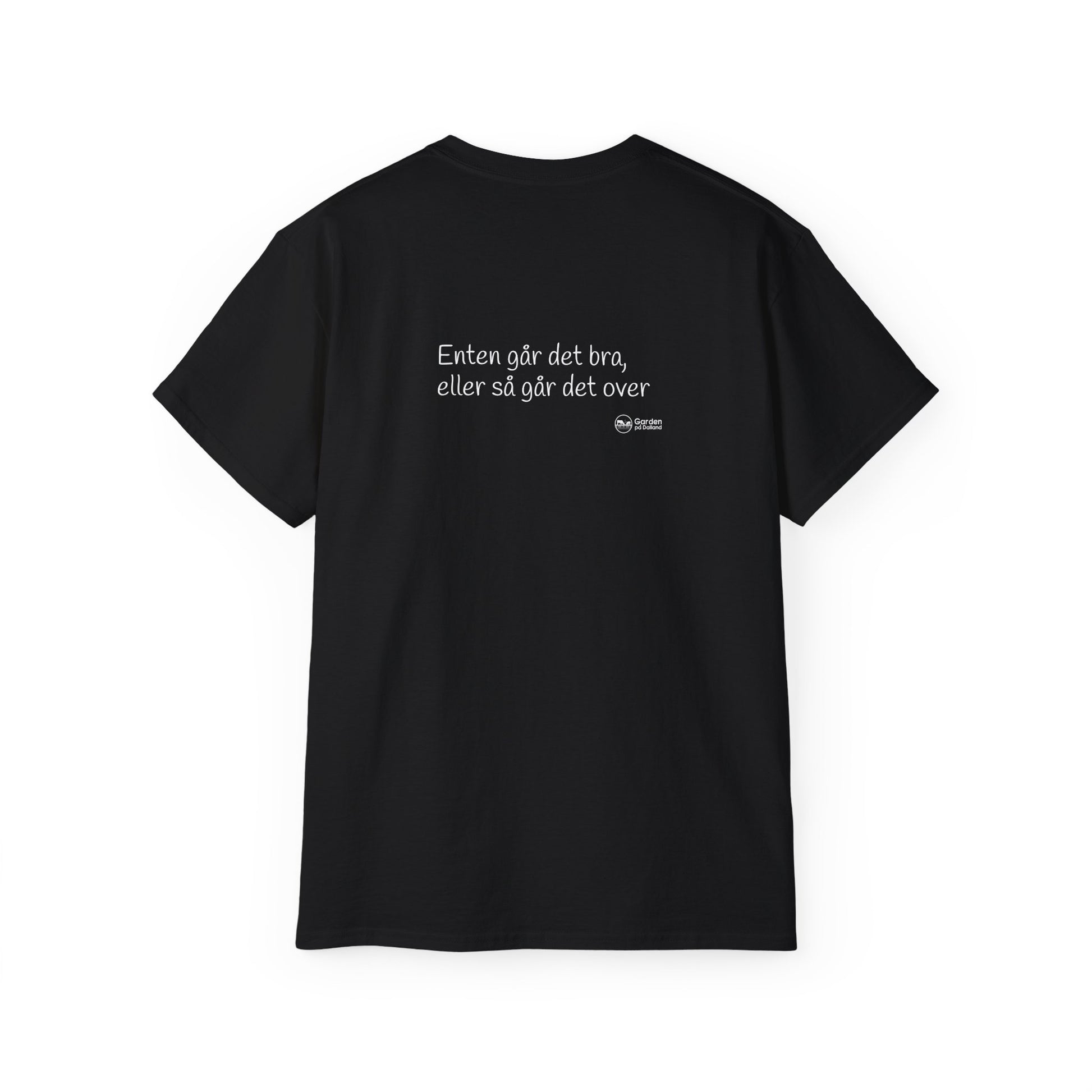"Enten går det bra, eller så går det over" T-skjorte. Denne unisex t-skjorta i bomull er laga for både komfort og stil. Kvalitetsbomull gjer at design kjem tydeleg fram, medan skuldersaumar og ribbestrikka hals gir god passform og elastisitet. Utan sidesaumar får skjorta eit reint og ryddig uttrykk. Stoffet er etisk produsert og berekraftig henta, så du kan bruke ho med god samvit.