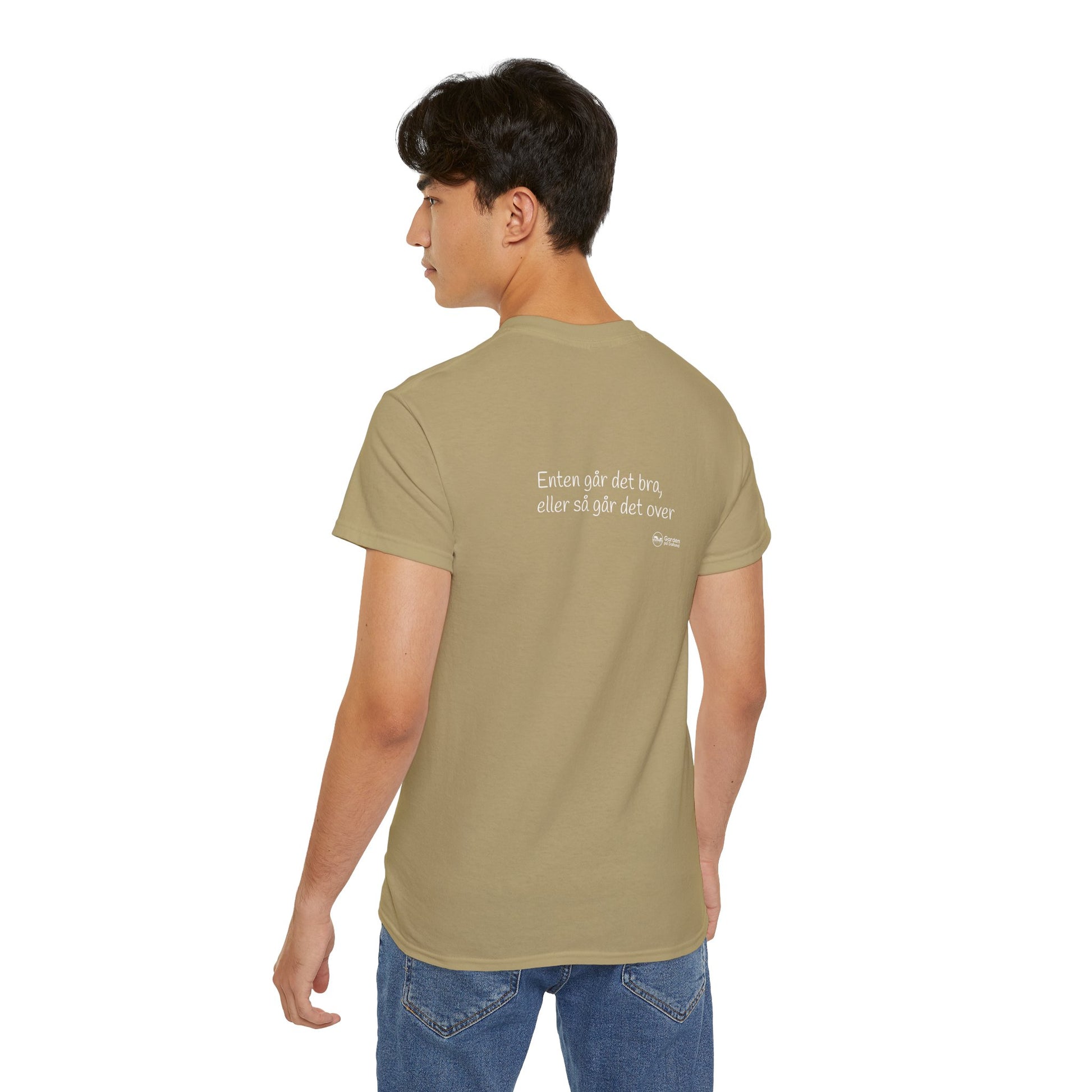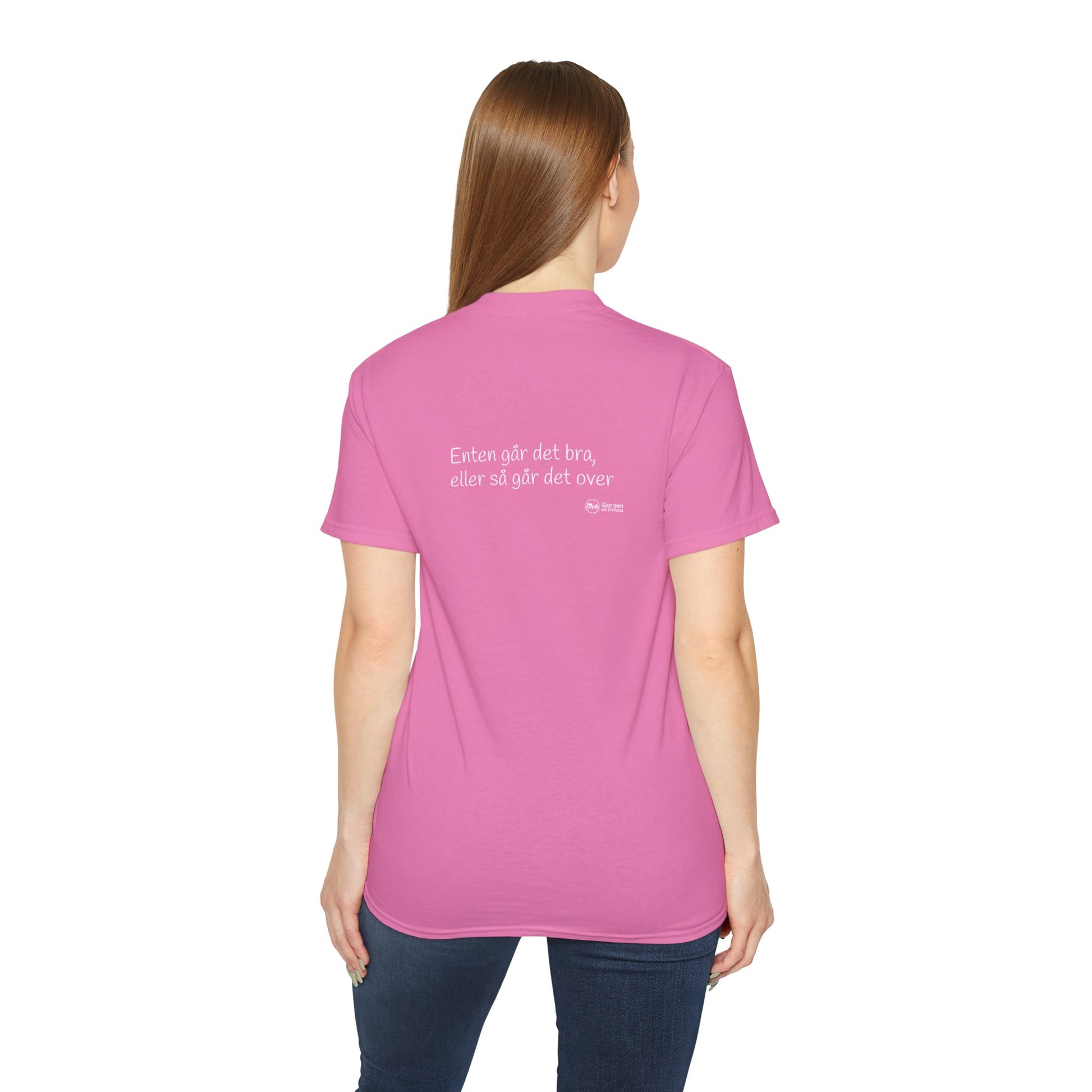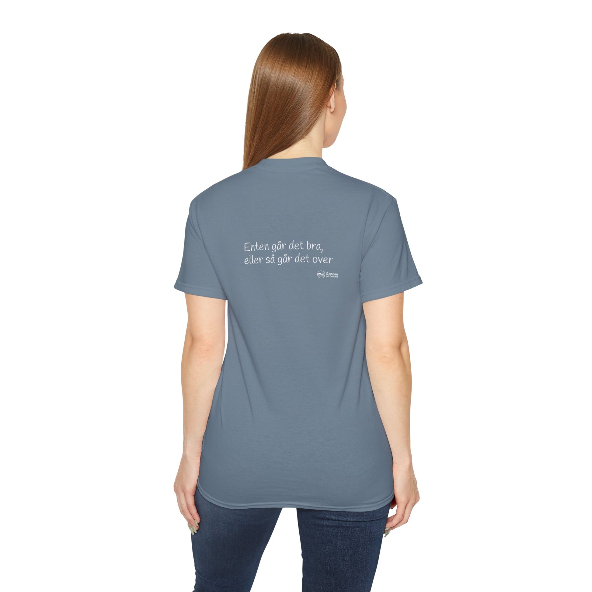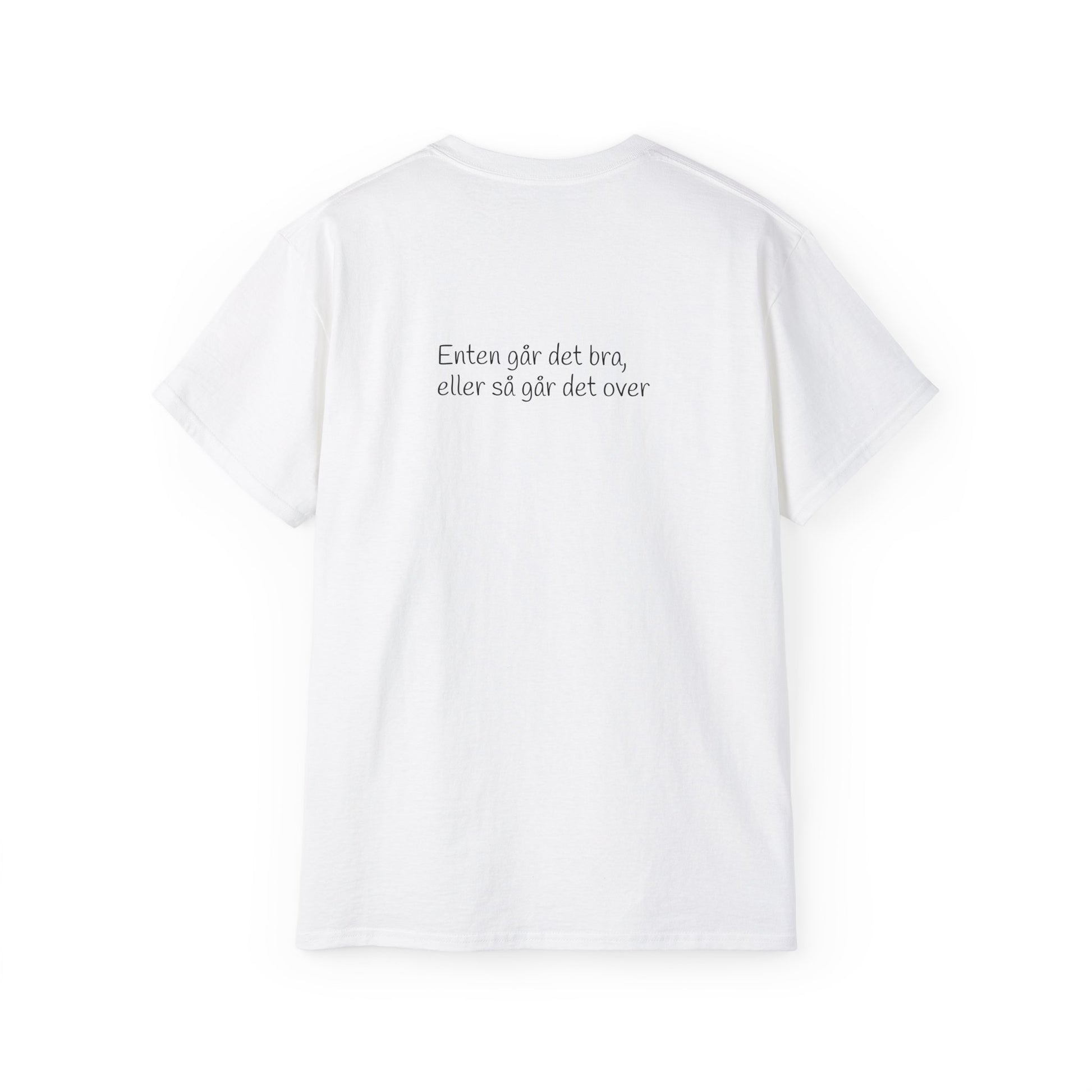 "Enten går det bra, eller så går det over" T-skjorte. Denne unisex t-skjorta i bomull er laga for både komfort og stil. Kvalitetsbomull gjer at design kjem tydeleg fram, medan skuldersaumar og ribbestrikka hals gir god passform og elastisitet. Utan sidesaumar får skjorta eit reint og ryddig uttrykk. Stoffet er etisk produsert og berekraftig henta, så du kan bruke ho med god samvit.